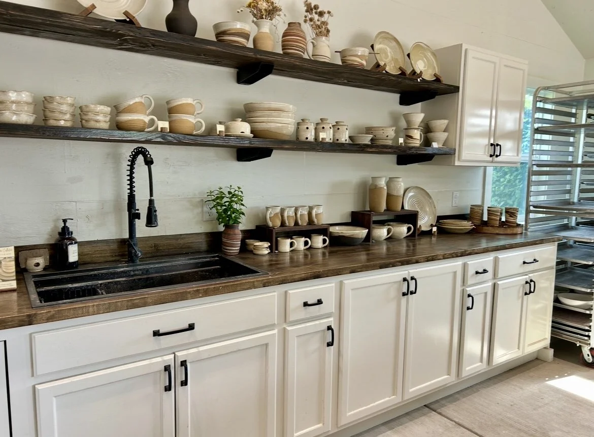 I recently made a significant investment in my small pottery business by creating a brand-new home studio! My vision was to have a functional space that would allow me to craft and showcase my collection in a kitchen-like environment. Open Shelves and natural wood elements were the heart of the design. After a full year of design and construction, it’s finally finished, and I couldn't be happier with the outcome. I am eternally grateful to my husband, parents, and friends for their unwavering support throughout this journey. My two young children were also deeply involved; I captured their adorable little handprints in the kiln room doorway, serving as a constant reminder of my motivation to make this business thrive.