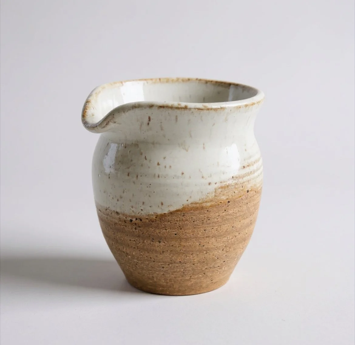 Neutral, semi gloss glaze poured inside & double dipped on the rim. Bare Clay texture on the outside.